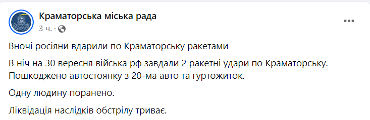 "У ніч на 30 вересня війська РФ завдали 2 ракетних ударів по Краматорську. Пошкоджено автостоянку з 20 авто та гуртожиток", - йдеться в повідомленні.