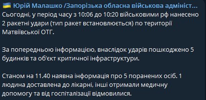 Війська РФ завдали двох ракетних ударів по Запорізькій області, п'ятьох людей поранено