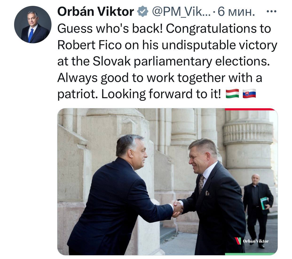 "Вгадайте, хто повернувся! Вітаємо Роберта Фіцо з безперечною перемогою на парламентських виборах у Словаччині. Завжди приємно працювати разом із патріотом", - написав Орбан.
