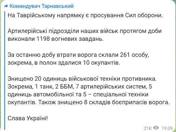 Тим часом командувач оперативно-стратегічного угрупування військ "Таврія" Олександр Тарнавський повідомив, що на Таврійському напрямку є просування сил оборони.