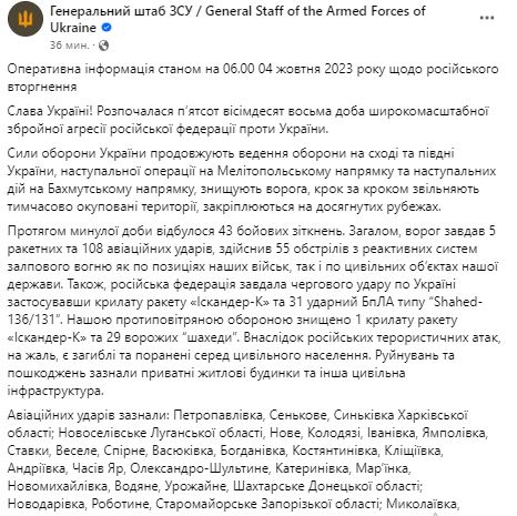 Уранці 4 жовтня Генштаб ЗСУ оприлюднив зведення про ситуацію на фронті.