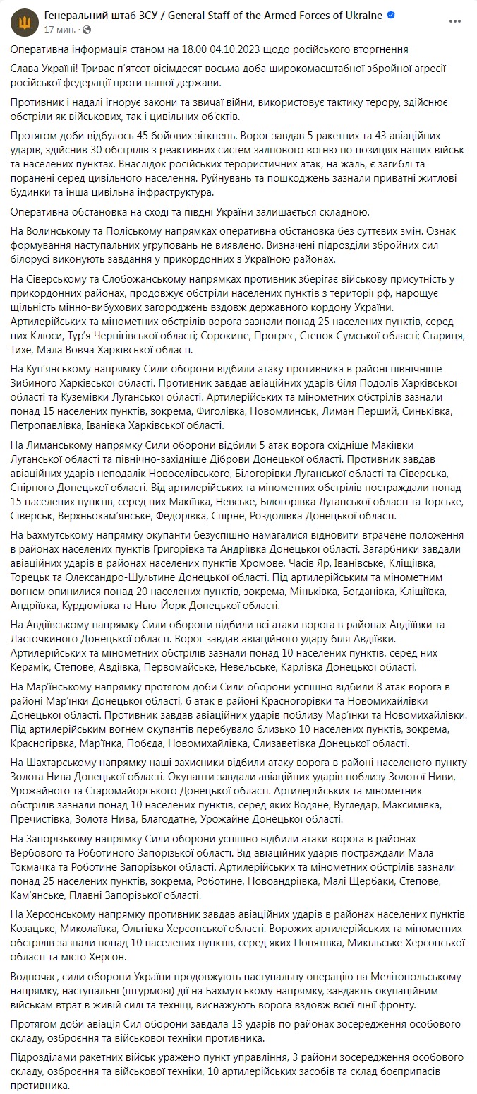 Генеральний штаб ЗСУ опублікував оперативну інформацію щодо ситуації на фронті станом на 18:00 4 жовтня.