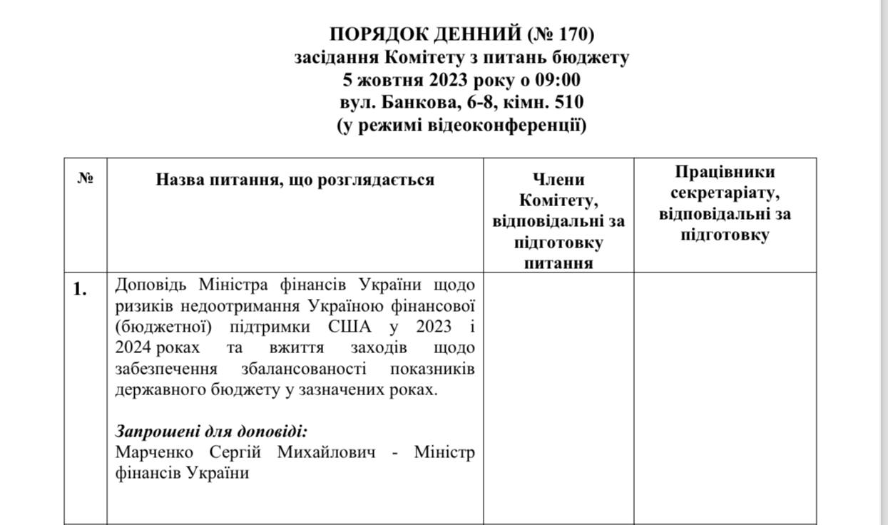 Завтра першим питанням на засіданні бюджетного комітету Верховної Ради буде доповідь міністра фінансів України Сергія Марченка щодо ризиків недоотримання Україною фінансової підтримки США у 2023 та 2024 роках та вжиття заходів щодо забезпечення збалансованості показників бюджету.