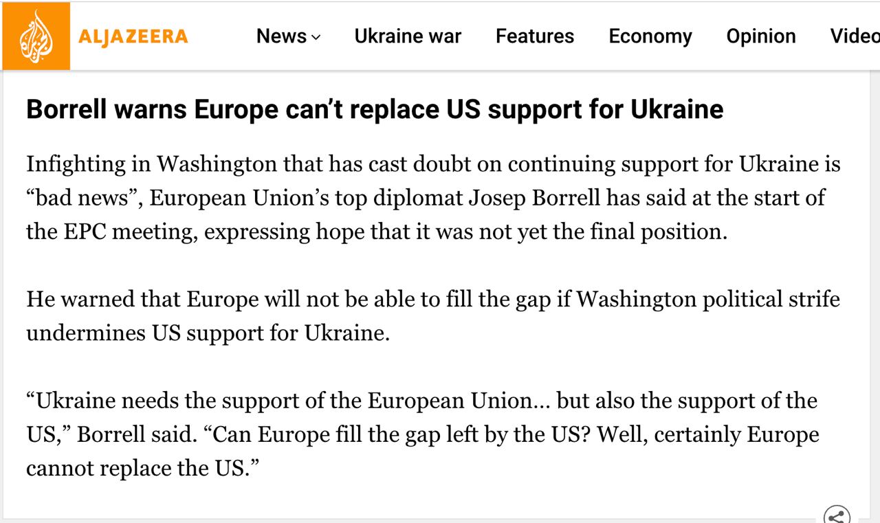 "Україні потрібна підтримка Європейського Союзу, але також і підтримка США. Чи зможе Європа заповнити прогалину, залишену США? Ну, звичайно, Європа не може замінити США", - сказав Боррель.