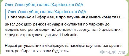 "В результаті двох ранкових ударів окупантів по Харкову до медиків екстреної медичної допомоги звернулися дев'ять цивільних, серед постраждалих – дитина 11 місяців", – повідомив Олег Синегубов.