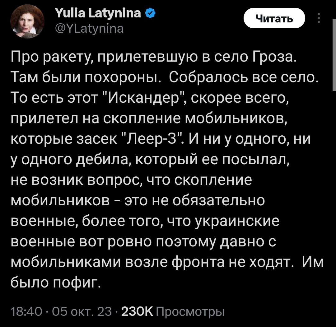 "Там був похорон. Зібралося все село. Тобто цей "Іскандер", швидше за все, прилетів на скупчення мобільників, які засік "Леєр-3" (комплекс радіоелектронної розвідки - Ред.). який її посилав, не постало питання, що скупчення мобільників - це не обов'язково військові, більше того, що українські військові ось саме тому давно з мобільниками біля фронту не ходять. Їм було пофіг", - написала Латиніна.