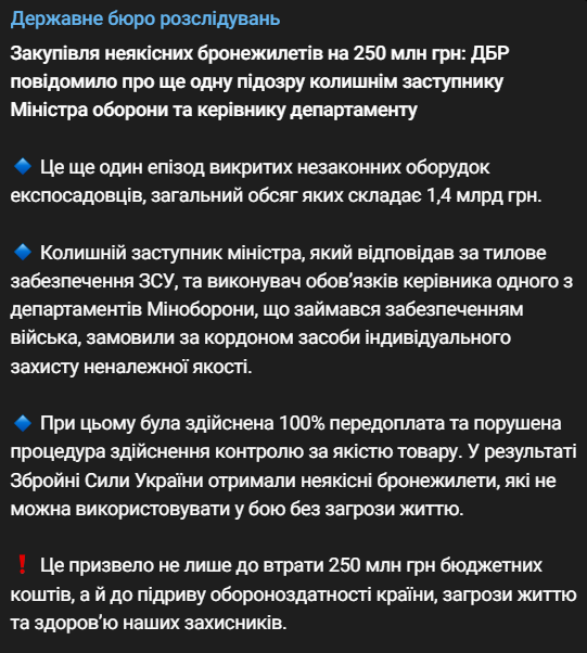 Вони закуповувалися за кордоном за стовідсотковою передоплатою з порушенням процедури контролю якості. Отримані засоби захисту виявилися непридатними для використання у бою.