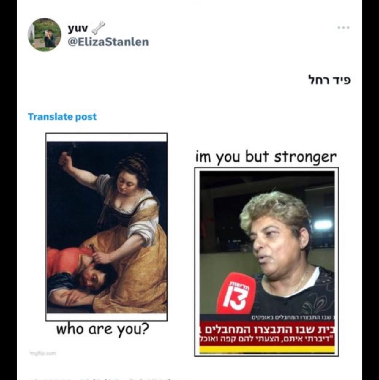 Рахіль стала героєм мемів в ізраїльському "Х", її навіть порівнюють із персонажем старозавітної Книги Суддів Яель, яка вбила ворожого євреям ханаанського воєначальника Сісару.