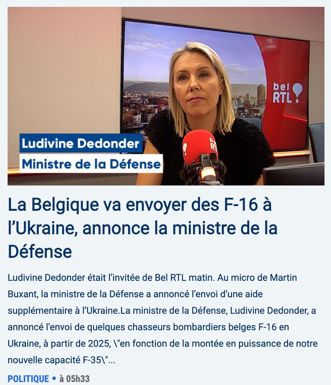 09.30 Бельгія відправить в Україну винищувачі F-16 лише 2025 року, повідомила міністр оборони країни Людовін Дедондер в ефірі брюссельського радіо Bel RTL.