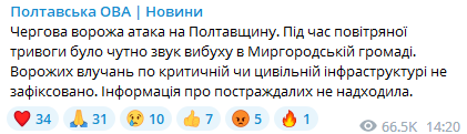 "Чергова ворожа атака на Полтавську область. Під час повітряної тривоги було чути звук вибуху у Миргородській громаді. Ворожі влучення по критичній чи цивільній інфраструктурі не зафіксовані. Інформація про постраждалих не надходила", - йдеться у повідомленні.