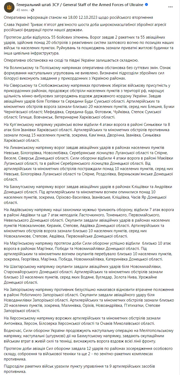 Генштаб ЗСУ опублікував оперативну інформацію про становище на фронті станом на 18.00 12 жовтня.