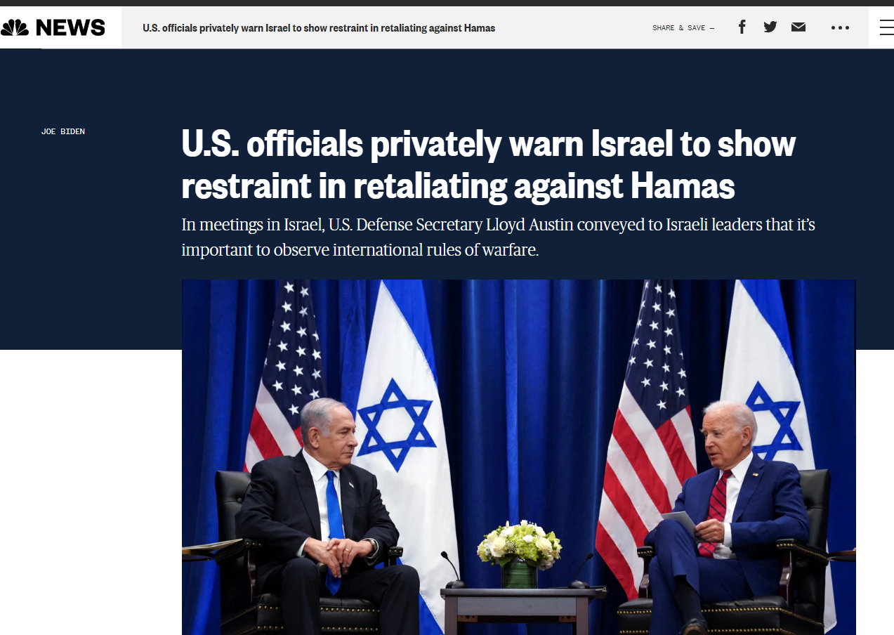 За словами двох нинішніх американських чиновників, у п'ятницю міністр оборони США Ллойд Остін під час зустрічі в Ізраїлі довів до відома прем'єр-міністра Ізраїлю Біньяміна Нетаньяху та міністра оборони Йоава Галланта, що важливо дотримуватись міжнародних правил ведення війни у боротьбі з ХАМАС.
