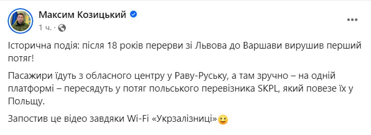 "Історична подія: після 18 років перерви зі Львова до Варшави вирушив перший поїзд!" - написав Козицький.