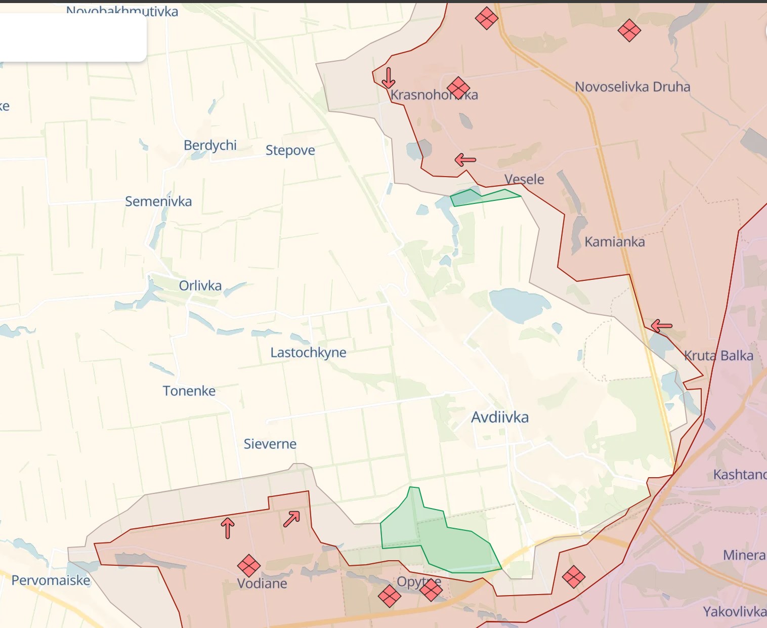За даними українських військових пабліків, найважча ситуація зберігається на північ від Авдіївки – з боку Красногорівки. Російські телеграм-канали пишуть, що там РФ вдалося просунутися у Степового. Також вони заявляють про просування у Первомайського та спроби повернути ініціативу біля Північного (обидва села - на південь від Авдіївки).