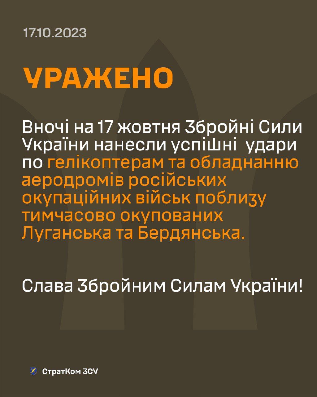 Подробиць ударів не наводиться. Повідомляється, що ЗСУ завдали успішних ударів по вертольотах та обладнання аеродромів російських окупаційних військ.