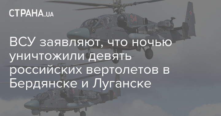 ЗСУ заявляють, що вночі знищили дев'ять російських гелікоптерів різних модифікацій на аеродромах у Бердянську та Луганську.