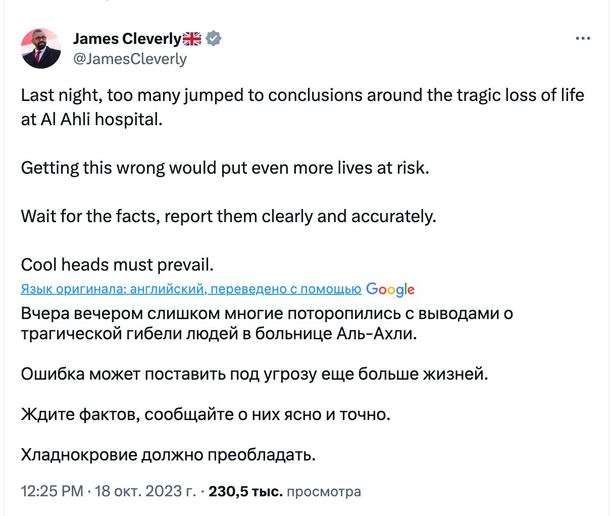 "Вчора ввечері дуже багато поквапилися з висновками про трагічну загибель людей у лікарні Аль-Ахлі. Помилка може поставити під загрозу ще більше життів. Чекайте на факти, повідомляйте про них ясно і точно. Прохолодність має переважати", - написав він.