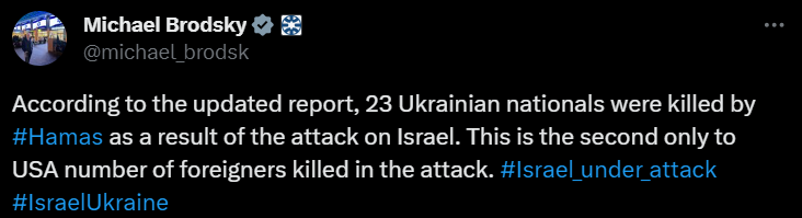 "Згідно з оновленим звітом, внаслідок нападу ХАМАСу на Ізраїль загинули 23 громадян України. Це друга після США кількість загиблих іноземців під час нападу", - написав Бродський.