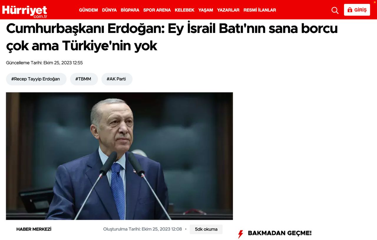 "ХАМАС – це не терористична організація, а визвольна організація, яка бореться за захист своєї землі. Ізраїль, Захід вам дуже багато винен, Туреччина вам нічого не винна", - заявив президент Туреччини.