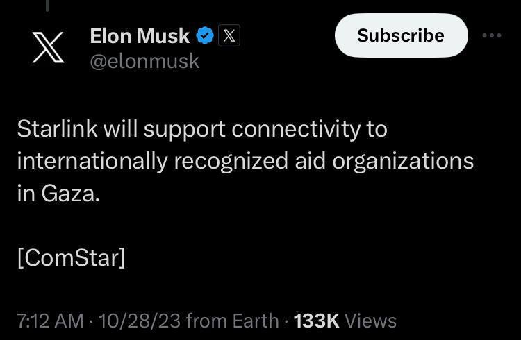 Ілон Маск передасть сервіс Starlink для міжнародних та гуманітарних організацій у секторі Газа