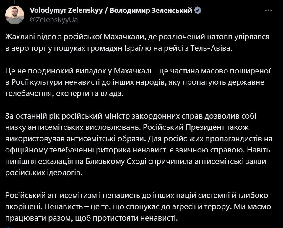 Події у Махачкалі прокоментував президент України Володимир Зеленський. Він заявив, що "російський антисемітизм і ненависть до інших націй системні та глибоко вкорінені".