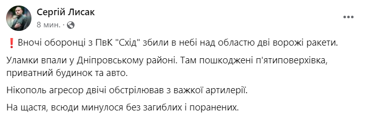 "Вночі захисники з ПВК "Схід" збили у небі над областю дві ворожі ракети", - написав він.