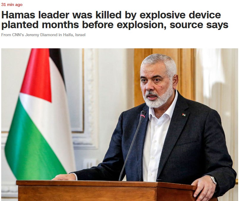 Політичного лідера ХАМАС Ісмаїла Ханію було вбито не внаслідок ізраїльського удару бомбою або ракетою, а внаслідок вибуху бомби, закладеної заздалегідь у гостьовому будинку в Тегерані, де він зупинився.