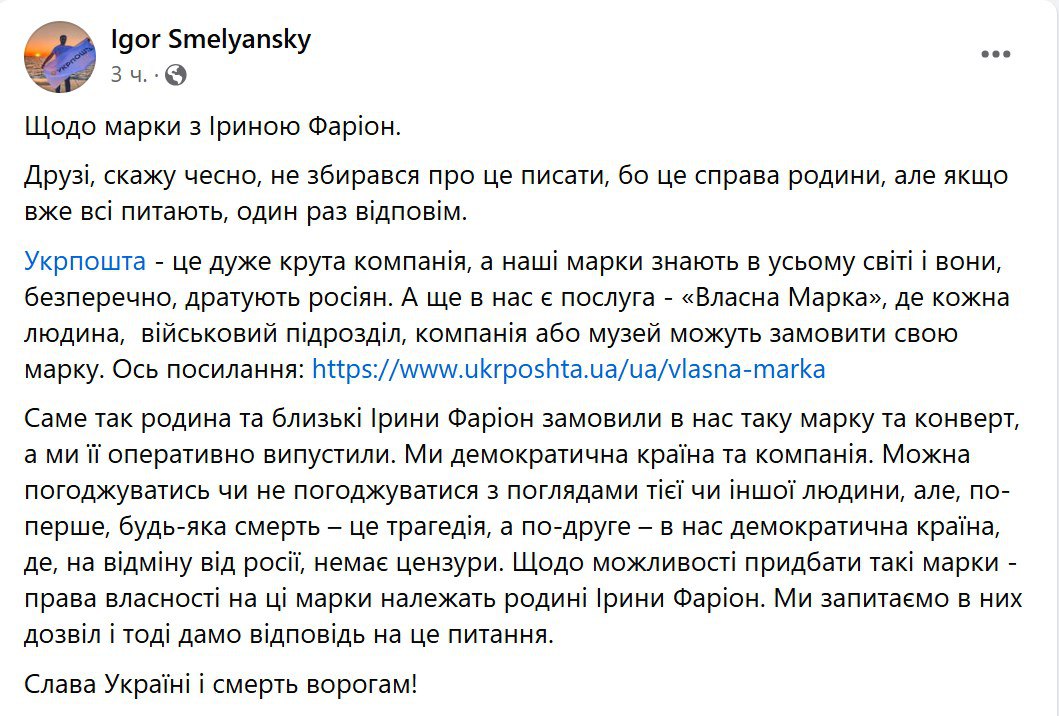 "Друзі, скажу чесно, не збирався про це писати, бо це справа родини, але якщо вже всі питають, один раз відповім....У нас є послуга - "Власна марка", де людина, військовий підрозділ, компанія чи музей можуть замовити свою марку. Саме так родина та близькі Ірини Фаріон замовили у нас марку та конверт, а ми її оперативно випустили. Можна погоджуватись чи не погоджуватися з поглядами тієї чи іншої людини, але, по-перше, будь-яка смерть – це трагедія, а по-друге – в нас демократична країна, де, на відміну від росії, немає цензури. Щодо можливості придбати такі марки - права власності на ці марки належать родині Ірини Фаріон. Ми запитаємо в них дозвіл і тоді дамо відповідь на це питання", - йдеться в публікації Смілянського.