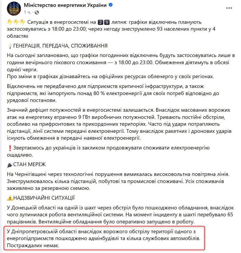 "Внаслідок ворожого обстрілу території одного з енергопідприємств пошкоджено адмінбудівлі та кілька службових автомобілів. Постраждалих немає", - сказано в ранковому зведенні відомства.