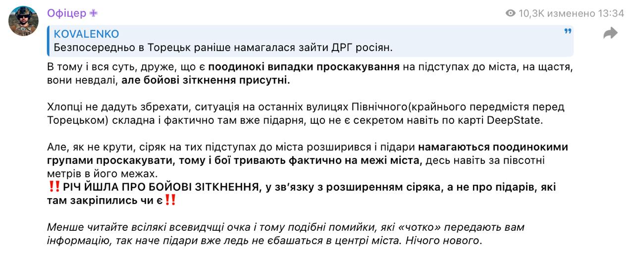 "Торецьк. Станом на зараз росіян у місті немає. Тому станом на 12:00 в цей день інформація про захід росіян у Торецьк не відповідає дійсності", - йдеться у повідомленні.