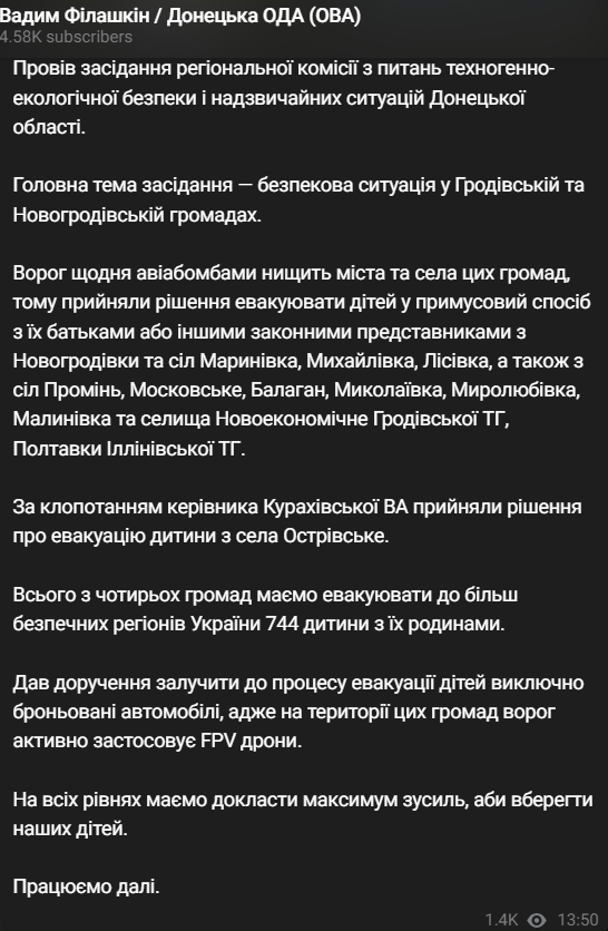 На Донеччині оголосили примусову евакуацію дітей з батьками з прифронтових населених пунктів Гродівської та Новогродівської громад через постійні авіаудари.
