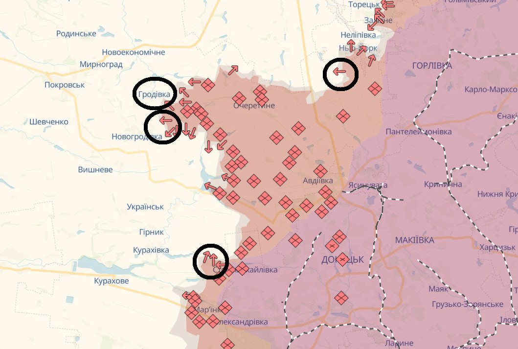 Військовий паблік Deep State повідомляє, що армія РФ сьогодні просунулась у районі чотирьох населених пунктів Донецької області: