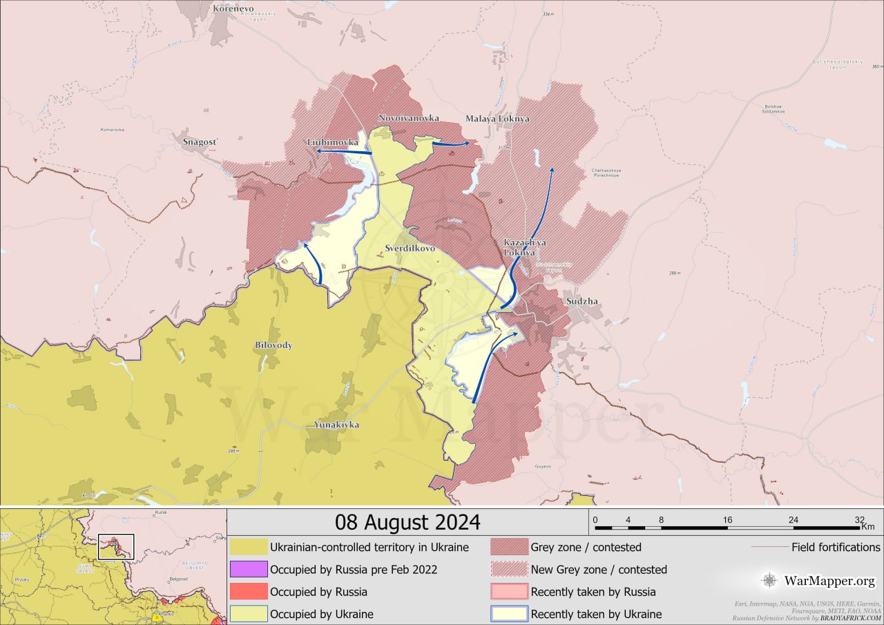 Відомий OSINT-блогер WarMapper, який малює карти війни в Україні, опублікував карту українського контролю в Курській області станом на 8 серпня.