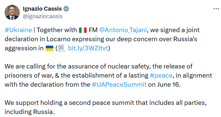 Про це йдеться у спільній декларації міністрів закордонних справ Італії та Швейцарії Антоніо Таяні та Іньяціо Кассіса, про підписання якої повідомив у соцмережі глава МЗС Швейцарії.