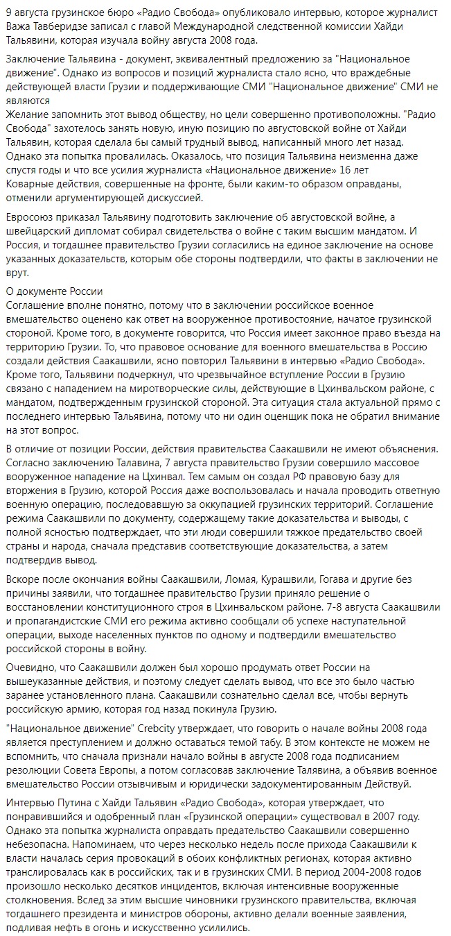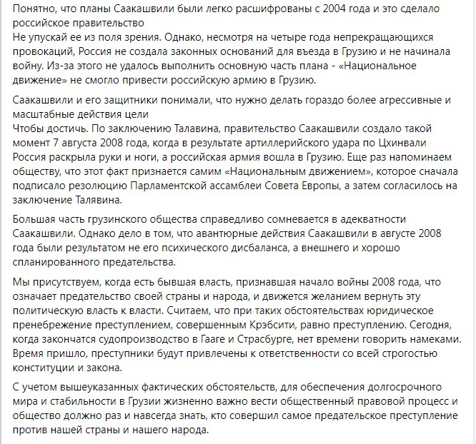 "Очевидно, що Саакашвілі мав добре продумати відповідь Росії на його дії, і тому можна зробити висновок, що все це було частиною заздалегідь встановленого плану. Саакашвілі свідомо зробив усе, щоб повернути російську армію, яка за рік до цього залишила Грузію... Більшість грузинського суспільства справедливо сумнівається в адекватності Саакашвілі. Проте річ у тому, що авантюрні дії Саакашвілі в серпні 2008 року були результатом не його психічної неврівноваженості, а результатом вказівок ззовні і добре спланованої зради", - йдеться в тексті.