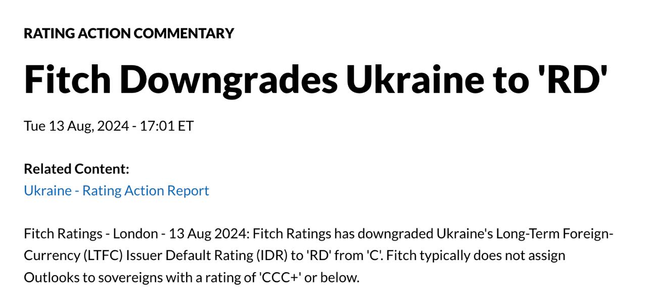 Рейтингова агенція Fitch Ratings знизила рейтинг України з рівня С до RD – обмежений дефолт.