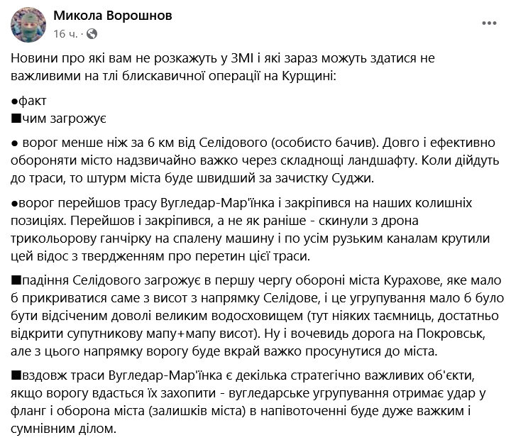 "Довго та ефективно обороняти місто надзвичайно важко через складнощі ландшафту. Коли дійдуть до траси, то штурм міста буде швидше зачистки Суджі. Ворог перейшов трасу Вугледар-Мар'їнка і закріпився на наших колишніх позиціях. Падіння Селідова загрожує насамперед обороні міста Курахове, який мав би прикриватися саме з висот із напрямку Селидово, і це угруповання мало б бути відсічене досить великим водосховищем", - пише Ворошнов у Фейсбуці.