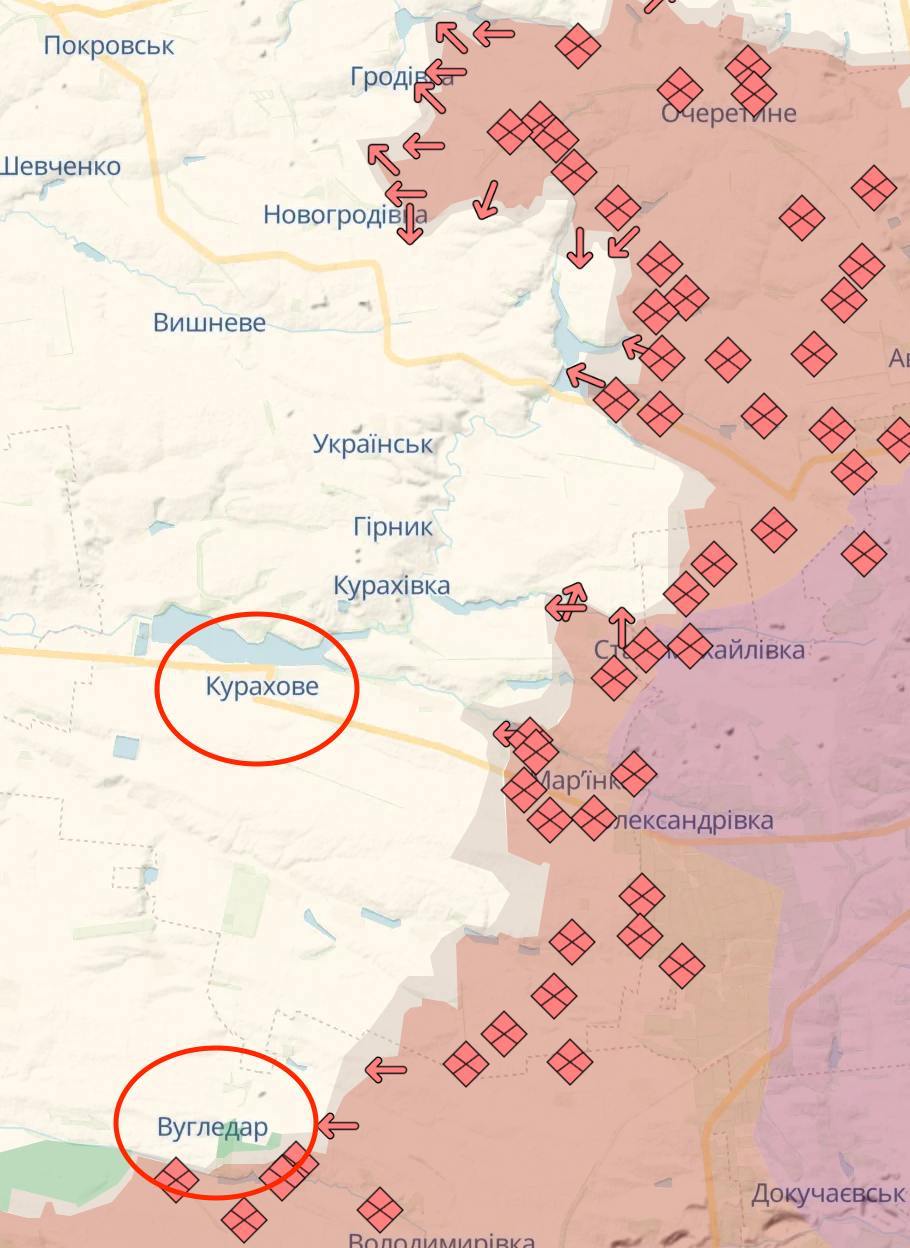 Також, за його оцінкою, є загроза напівоточення угруповання в Вугледарі, якщо РФ вдасться захопити низку важливих об'єктів уздовж траси Вугледар-Мар'їнка.