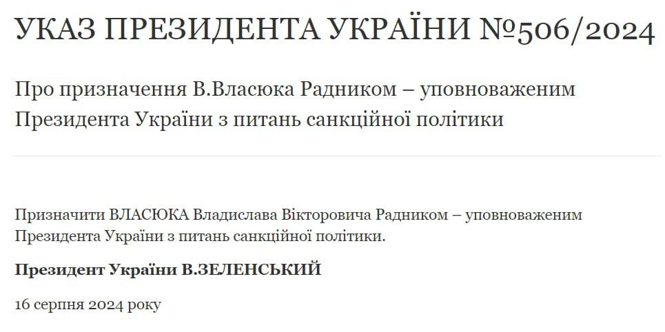 У п'ятницю, 16 серпня, президент України Володимир Зеленський призначив Владислава Власюка уповноваженим із санкційної політики.