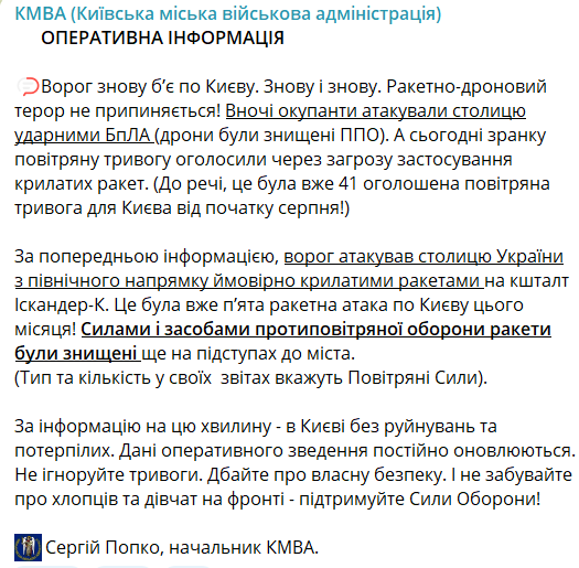 Також Київ був атакований уночі дронами, а під ранок крилатими ракетами. Військова влада столиці заявила про збиття всіх цілей та відсутність збитків.