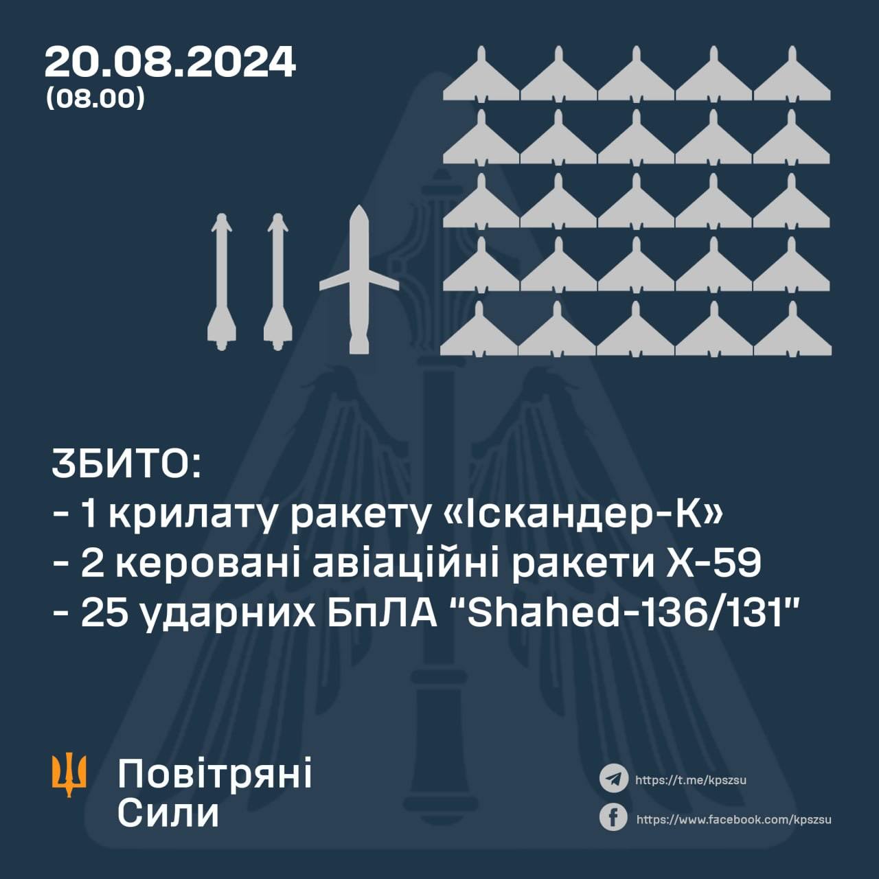 Вночі 20 серпня сили української ППО збили 25 із 26 безпілотників "Шахед", один із трьох "Іскандерів" та дві авіаракети Х-59.