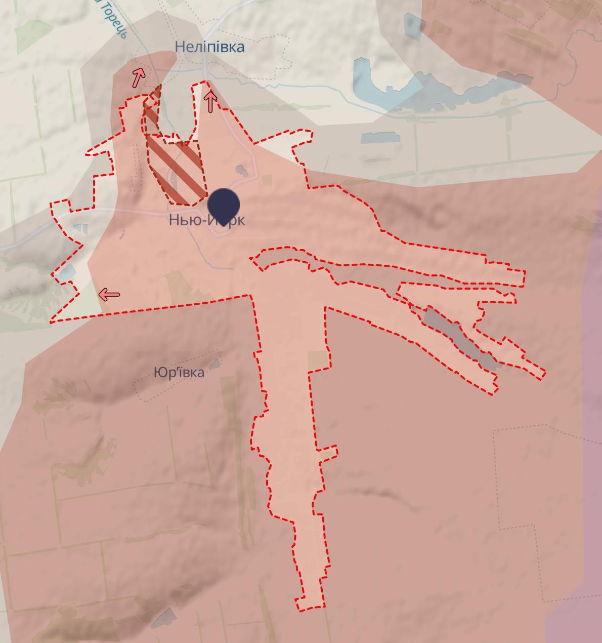 Раніше Deep State повідомляв про просування росіян у селищі. Наразі на карті ресурсу в Нью-Йорку не вказано територій під контролем ЗСУ. Лише деякі околиці позначені у сірій зоні.