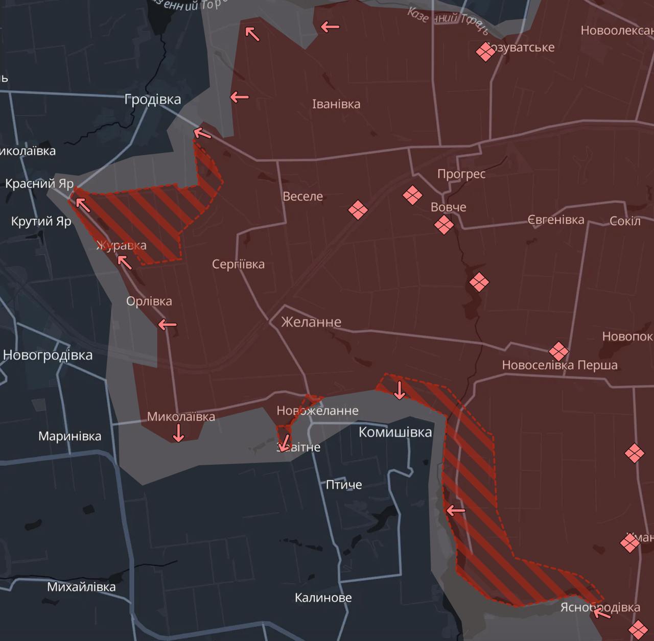 На Покровському напрямку росіяни захопили минулої доби три села - Межове, Нудне та Журавку - а також просунулися біля Гродівки та Заповітного, повідомляє Deep State.