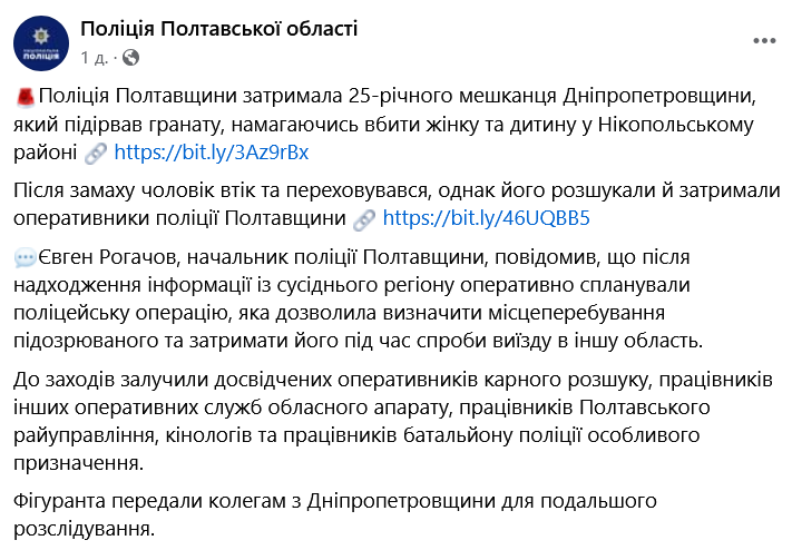 На Полтавщині затримали чоловіка, який місяць тому у Нікополі кинув гранату за дружину та дитину.