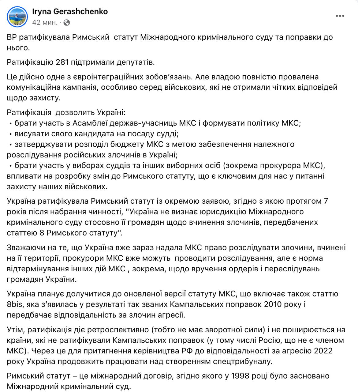 "Через побоювання, що МКС може притягнути до відповідальності громадян України в умовах війни, триває дискусія щодо часу ратифікації", - написала нардеп від "Європейської солідарності".