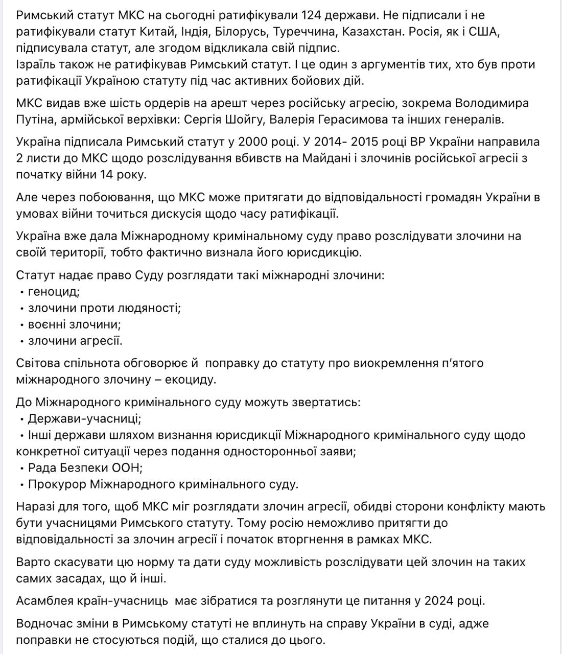 "Україна ратифікувала Римський статут з окремою заявою, згідно з якою протягом 7 років після набуття чинності "Україна не визнає юрисдикцію Міжнародного кримінального суду щодо її громадян про скоєння злочинів, передбачених статтею 8 Римського статуту". З огляду на те, що Україна вже зараз надала МКС право розслідувати злочини, скоєні на її території, прокурори МКС вже можуть проводити розслідування, але є норма відстрочення інших дій МКС, зокрема, про вручення ордерів та переслідування громадян України", - сказано у публікації нардепа.