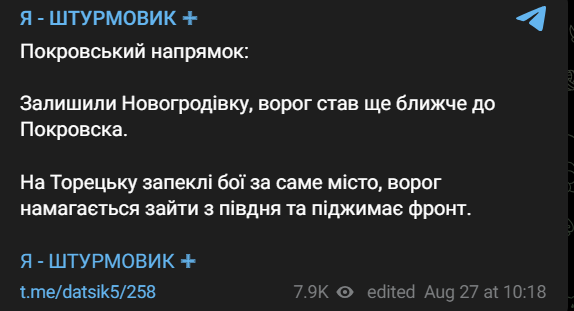 Боєць третьої ОШБр Владислав "Дацик" повідомив, що ЗСУ відступили з Новогродівки на Покровському напрямку.