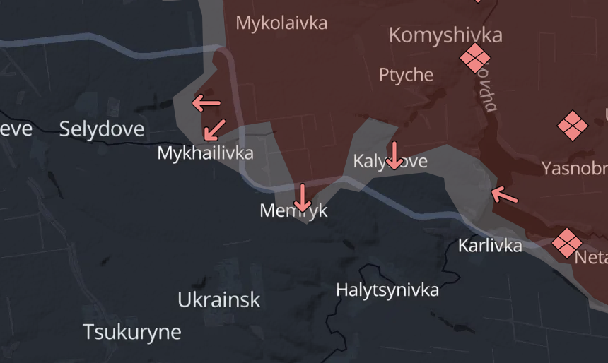 На південному фланзі втрачено село Пташине, повідомляє Deep State. Також росіяни просунулися в районі Калинове, Мемрика, Карлівки, Червоного Яру та Михайлівки. Паблік дає зрозуміти, що ситуація вкрай загрозлива і може йтися про імовірну втрату Селидова: "Те, що сталося з Новогродівкою і те, що станеться з Селидовим, має стати об'єктом уваги не лише суспільства, а й відповідних органів. Досвід та відсутність покарання за Очеретино породило нову трагедію, свідками якої стає кожен із нас”.