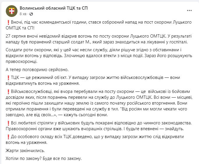 "Вночі, під час комендантської години, стався збройний напад на пост охорони Луцького ОМТЦК та СП! 27 серпня вночі невідомий відкрив вогонь за постом охорони Луцького ОМТЦК. Внаслідок нападу було поранено старшого солдата М., який зараз перебуває на лікуванні в госпіталі. Солдати роти охорони, які в цей час несли службу, діяли рішуче за обставинами і відкрили вогонь у відповідь Злочинцю вдалося втекти з місця події. Зараз його розшукують правоохоронці.