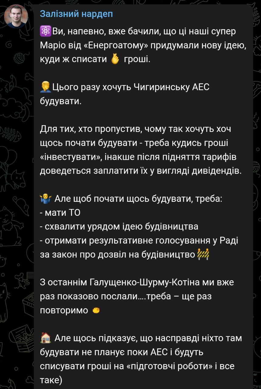 "Треба кудись гроші списати, інакше після підняття тарифів доведеться заплатити їх у вигляді дивідендів. Щось підказує, що насправді ніхто там будувати не планує поки АЕС і списуватимуть гроші на "підготовчі роботи" і таке інше", - пише депутат.
